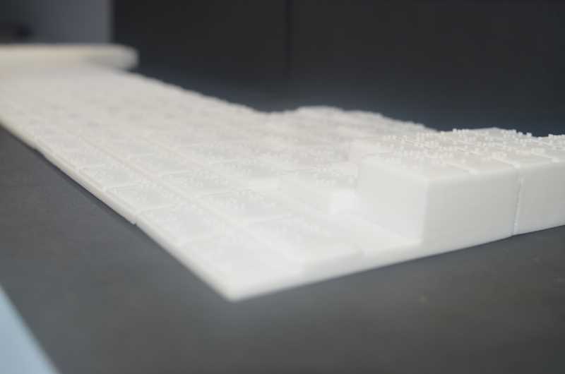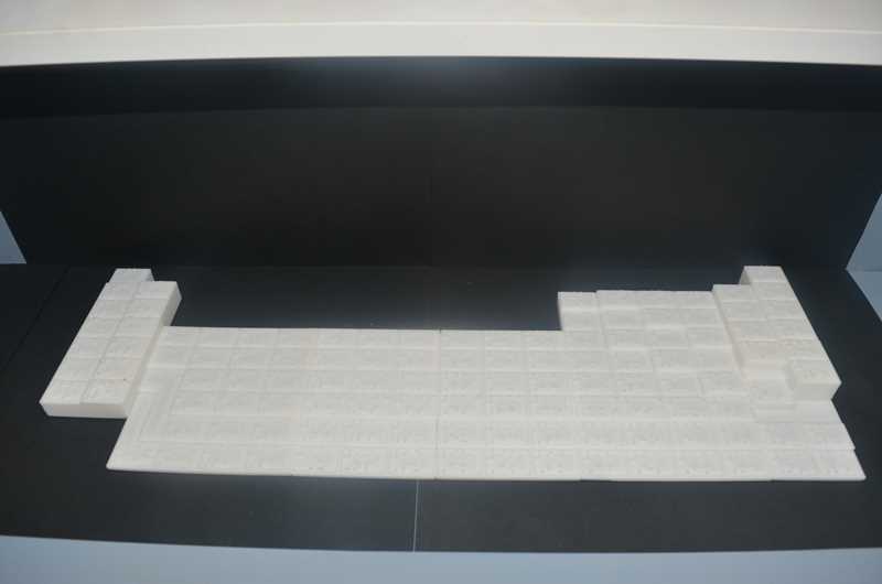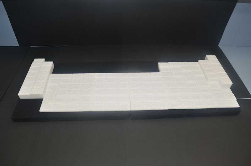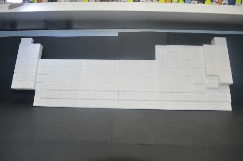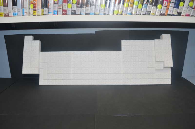 This is a custom designed 3D Periodic Table in Braille. It is designed to help a vision impaired student to use the table as it is supposed to be used. Many visually impaired students only have a simple list of the elements. The Periodic Table was originally designed in such a way that it helps scientists understand the commonalities between elements and also the reactivity of each group. A list of elements can not give students the same understanding as the full Periodic Table can. This Periodic Table consists of the element number and symbol written in Braille, the vertical height differences depict the different sub-sets of elements. This makes teaching the chemistry behind the elements much simpler.